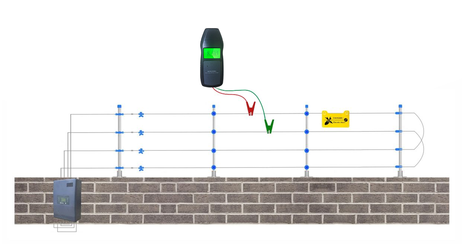 1.脈沖主機電壓測量:脈沖主機布防工作後,把脈沖電壓測量儀的夾具分布夾在脈沖圍欄上任意相鄰的兩根線上,如下圖所示:
