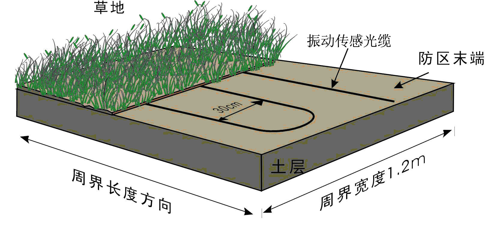 在沙土地下埋設振動傳感光纜時,也採用平行鋪設多道振動傳感光纜的鋪設方式,但由於沙土比較松軟,當入侵者進入該區域時,透過沙土層對振動傳感光纜施加壓力,振動傳感光纜可探測到微小的擠壓變形並産生信号,所以在沙土地埋設振動傳感光纜時,應減少平行振動傳感光纜的間距 ,而且埋設不可過深。通常採用的間隔爲20--25cm,埋設深度爲5--10cm,如圖。在進行施工時,首先在需要鋪設光纜的區域挖出一道寬1.2m,深10cm的凹槽,在凹槽的底部平鋪一層厚度爲3cm的粗沙,再将振動傳感光纜平行鋪設於粗沙表面,每隔50cm用鋼絲線卡子固定。光纜鋪設完成後,在其上面覆蓋一層厚度爲5cm的粗沙,最後在其表面均勻地覆蓋一層1--2cm的地表介質(細沙或松散幹燥的泥土)。